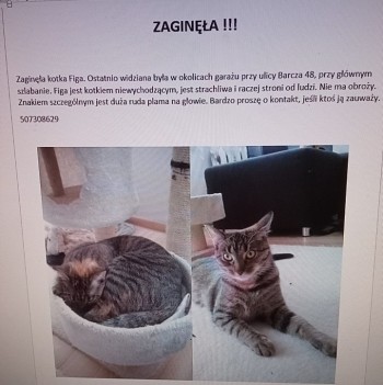 Data zaginięcia: 06/10/2022 Miejscowość: Olsztyn Telefon: 507308629 Numer mikroczipa: 616093900268645 Nr ID szczepienia: Płeć: Samica Gatunek: Kot Rasa: Europejska