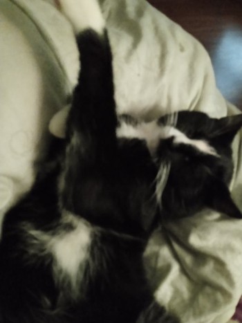 jest to jeszcze nie wykastrowany kotek ma białe skarpetki i różowe poduszeczki może się bać ludzi ze świata zewnętrznego ponieważ nie był kotem wychodzącym, ma charakterystyczny piskliwy głos