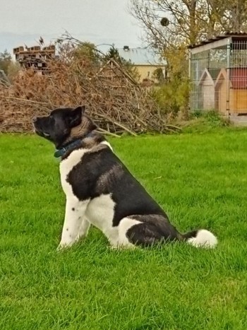 Czarny grzbiet, łapy oraz brzuch białe. Suczka nie jest agresywna.