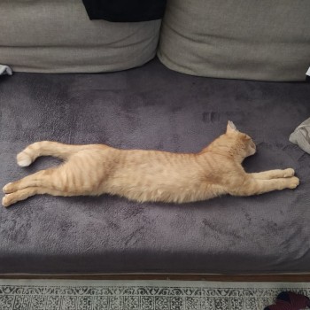 Kot reaguje na imię Garfield jest wykastrowany, końcówka ogona jest biała.