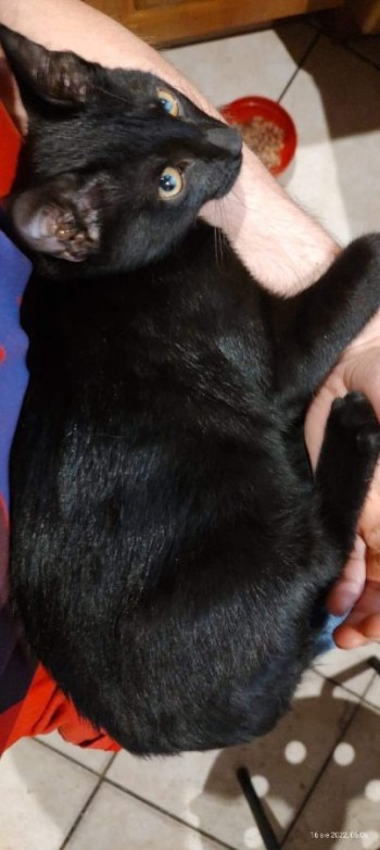 Kotek jest maści czarnej i na obruszce ma czerwoną zawieszke