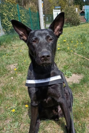 Czarny, smukły, płochliwy, może szczekač na nieznajome mu osoby, nie jest groźny!