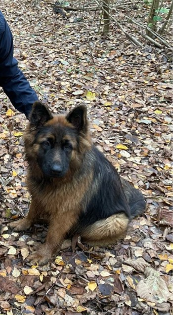 Piesek posiada czarną skórzaną obrożę.