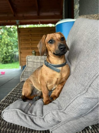 Mały , rudy , podpalany , czarne oczy i malutki biały krawat