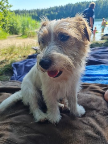 Szorstkowłosa suczka jrt, brązowe uszka i część pyszczka, jedna łata po lewej stronie, okolice uda. Dość płochliwa. Miała czerwoną obrożę z imieniem i numerem telefonu oraz obrożę foresto.