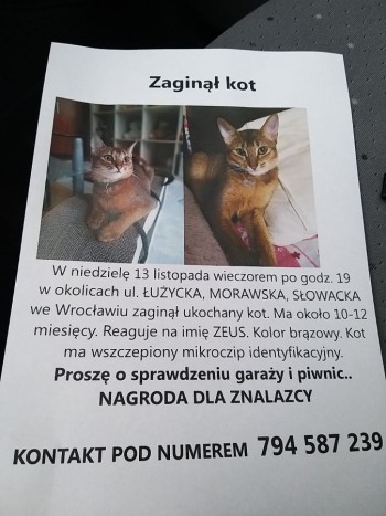 Data zaginięcia: 13/11/2022 Miejscowość: Wrocław Telefon: 794 587 239 Numer mikroczipa: 616093902026431 Nr ID szczepienia: Płeć: Samiec Gatunek: Kot Rasa: Abisyński
