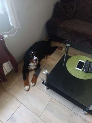 Łagodna 7 miesięczna suczka, ma na szyji , obrożę koloru czerwonego ,jest dość masywna około 35-40 kg .