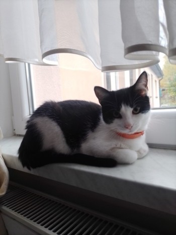 kot domowy, krótkowłosy czarno-biały, z pomarańczową obrożą. bardzo boi się obcych i hałasu