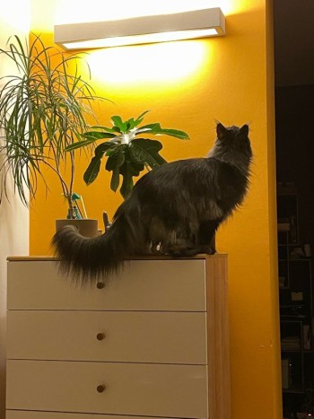 Kotka, niewychodząca, raczej nieufna. Sierść czarna z popielatym podszerstkiem, oczy żółtozielone. Wymknęła się przez drzwi wejściowe klatki.