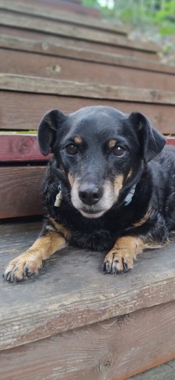 Nazywa sie pinio, sierść czarna podpalana, niski przed do połowy łydki, cały czas Merdajacy ogonkiem, łasy na jedzenie