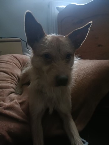 rudy pies z zieloną obrożą ma krótką sierść