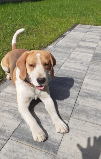 4 letni beagle, nazywa się Bagi. Posiada brązową obrożę na które są napisane dane.