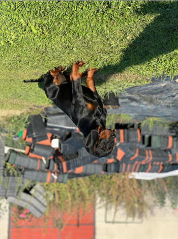 KORA ma zajęczą wargę, umaszczenie: czarny podpalany, Tatuaż 483K, urodzona w maju 2022 (obecnie 7 miesięcy), na przednich łapach i pysku ma brązowe umaszczenie.