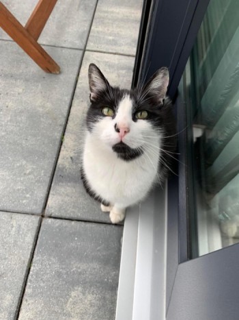 Biało-czarny kotek z widoczna czarna plamą na dolnej części szyi, zielone oczy, szczupły kot