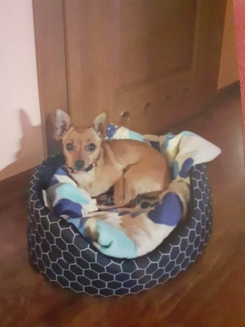 Mała suczka w kolorze biszkoptowo- brązowym bez ogonka. Miała czerwoną obrożę. Wabi się Fredzia.