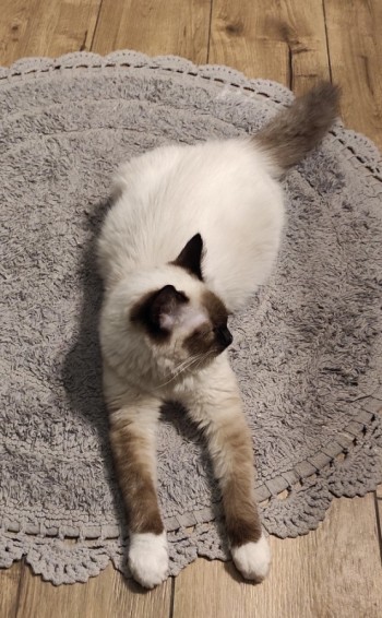 Futro kremowo -biale . Uszy, pyszczek, łapki i ogon ciemno szare