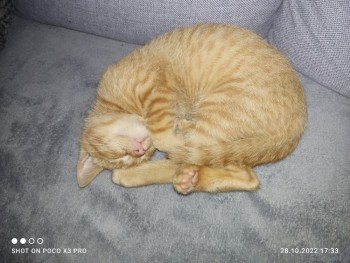 pół roczny kotek , rudy lekko pręgowany , dwie małe dziewczynki bardzo się o niego martwią