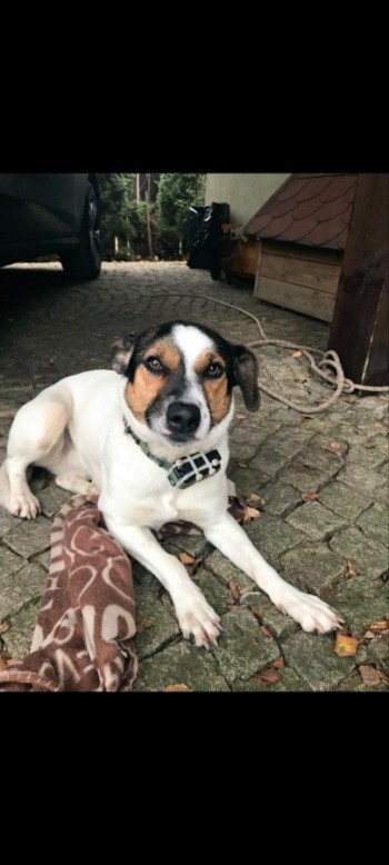 Sunia niezbyt duża, niespełna do kolana, biała w łaty brązowo - czarne. Na szyi ma obrożę elektryczną.