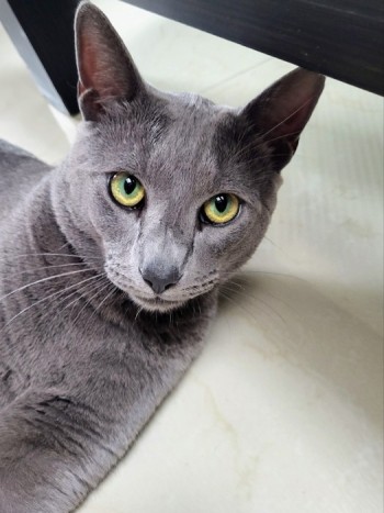 Kotek jest rasowy, koloru szarego ma zielone oczy, duży postawny waży około 6 kg.