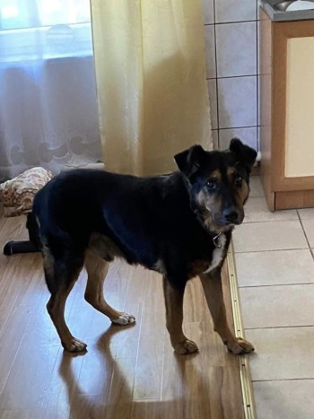 pies- Atos. Mieszaniec średniej wielkości (do kolana). Pies ma na sobie obrożę. Jest prawie głuchy i ma problemy z tylnymi nogami.
