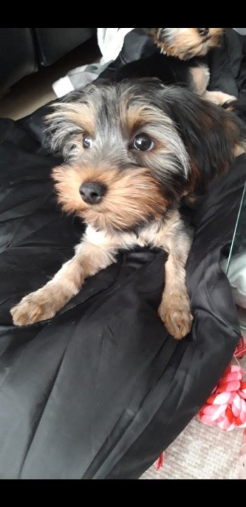 Suczka Mimi, kolor czarno-szary grzbiet lapki bezowe z jasnobrazowa mordka i ma posrebrzany czubek noska. Uszka oklaple, nie stojace.