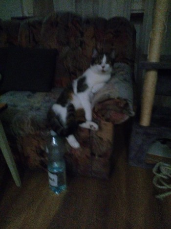 kot umaszczony biało i szaro, pod pyszczkiem rudawa plamka,na nosku czarna plamka,oraz na poduszkach łap