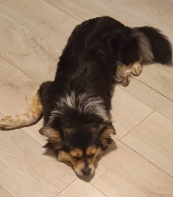 Pies który zaginą, wabi się Bajka, ma czarnobiałe włosy