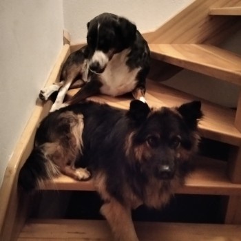 bardzo łagodny, po przejściach, z wyglądu przypomina owczarka grenlandzkiego,