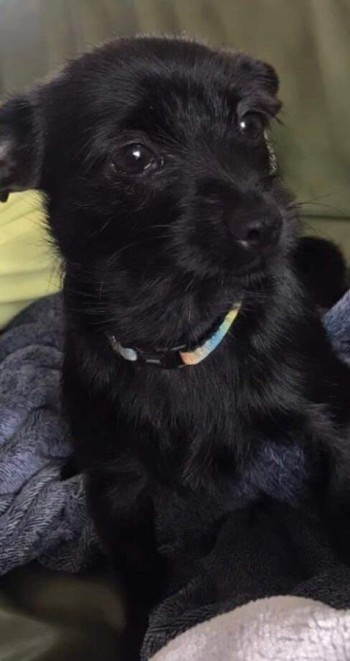 czarna suczka wagi około 3 kilo beż obroży reaguje na imię eris na szyi ma kołnierz że sterczącej na odwrót sierści
