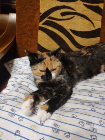 Kotka tricolor, wysterylizowana, charakterystyczna czarna plama na pyszczku.