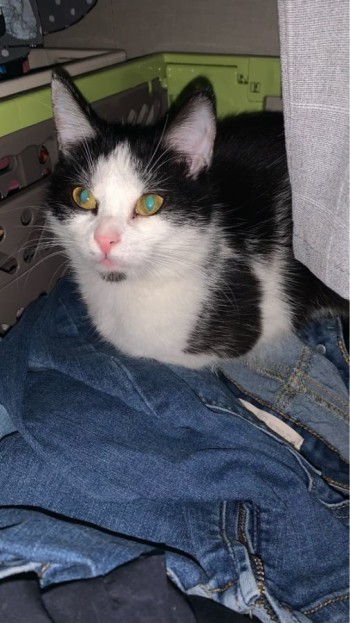 Kotka o umaszczeniu czarno-białym charakterystyczne białe umaszczenie w okolicach mordki i pod nią. Na tułowiu i łapkach również białe. Włos dłuższy jedwabisty. Kotka ma około 3 lata i jest stosunkowo duża około 4 kg. Kotka jest wysterylizowana i posiada czipa ale nie jest zarejestrowany.
