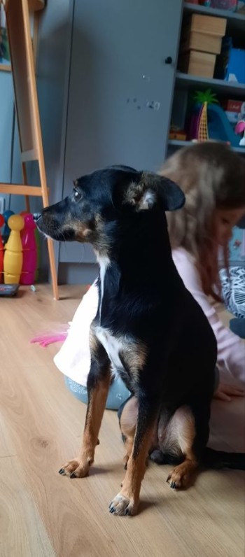 Wabi się Kluska. Mały czarny kundel z białym krawatem. Lękliwa, boi się ludzi