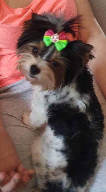 Mała, dwuletnia suczka rasy Biever Yorkshire Terrier, wysokości ok 20 cm, maści czarno-biało-złotej, krótko obcięta.