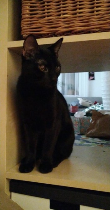 Czarny, młody kocur z wyraźnie uszkodzonymi oczami, płochliwy.