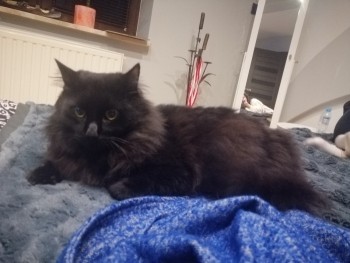Duży dorodny kocur o czarnym długowłosym umaszczeniu. Wabi się Zinka.