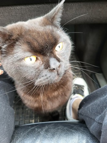 Czarny kot, duży, ma tęczową obrożę. Wabi się Bueno.