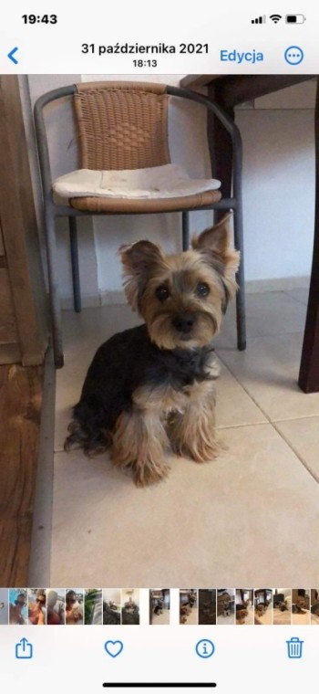Piesek rasy YORK wabi się SIMBA w wieku 15 lat, choć nie wygląda. Czarne umaszczenie, kremowa głowa i łapki. Posiada obrożę z bursztynu, ma mikrochip, jest chory na serce potrzebuje leków i specjalnej karmy. Waga ok 5kg, duży jak na YORKA , nie dosłyszy, zestresowany, nieufny ale należy go porostu złapać. PIESEK Zaginął 17/08 w okolicy Węgrzc Wielkich koło Krakowa, prawdopodobnie widziany 19/08 w okolicy Sułkowa, Tomaszkowic, Lednica Górna.