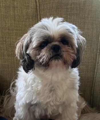 Suczka rasy shih tzu, włos biało-szaro-bezowy, łagodne usposobienie, nie lubi kurierów i panów w szerokich spodniach