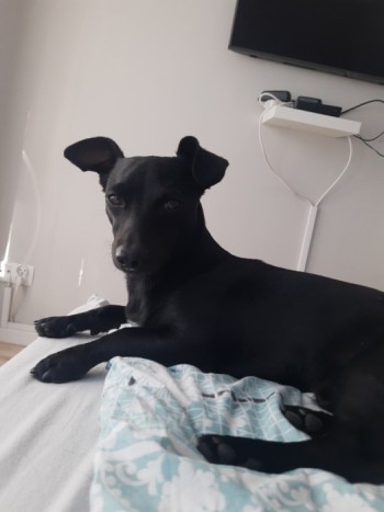 piesek Wabi się Koksik,jest cały czarny i ma biały krawacik, oraz charakterystyczny zawinięty do góry ogonek