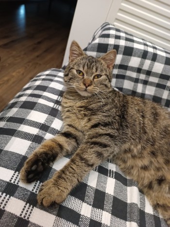 Kotek bury, pręgowany jak na załączonym zdjęciu. Kot wychodzący, dosyć towarzyski. Ostatnio widziany 1.5 miesiąca temu.