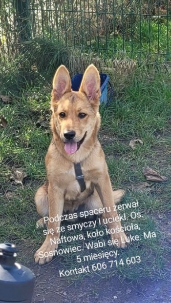 Pies waży ok 17kg, ma 8 miesięcy, krotka sierść, brązowy, mieszaniec, podobny do lisa, duże odstajace uszy, ma na sobie czerwono-czarne szelki, ma adresowke, gps,który juz nie działa :( wabi się Luke, jest płochliwy