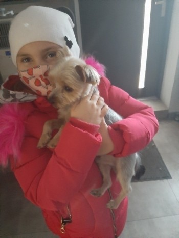 piesek jest oszczyzony na ta chwile ma masc szaro-srebrno-niebieska, jest bardzo przyjazny uwielbia jeździć samochodem. Bily ma oklapniete uszka- nie stoją od urodzenia, na łapkach ma dłuższą sierść zostawiona waży około 2kg jest miniaturką yorka. w domu czeka autystyczna właścicielka.