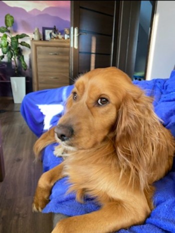 Łagodny, rudy, w typie cocer spaniela , niebieska obroża