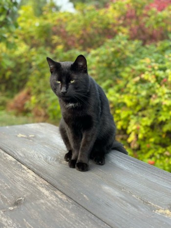 Czarny, z białym na szyi. Prawa przednia łapka lekko wygolona po zabiegu 1,5 miesiąca wcześniej.