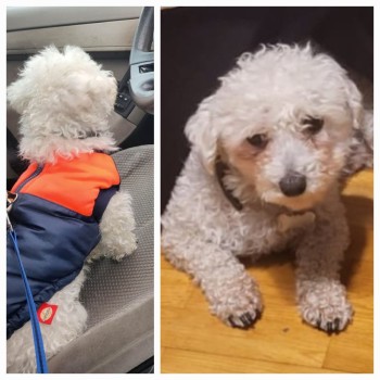 maltańczyk ubrany w granatowo-pomaranczowe ubranko, wada zgryzu,