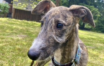 Chart, suczka szorstkowłosa pręgowana, biała sierść wokół nosa i na brzuchu. Ma obrożę z brązowej skóry. Reaguje na imię Zulema.