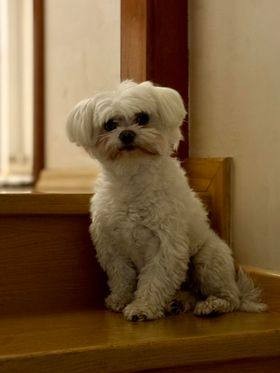 Maltańczyk mini, biały, jedno oko niebieskie, drugie czarne.