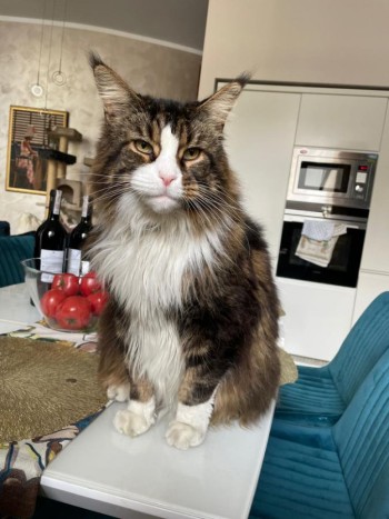 Duży kot rasy Maine Coon. Barwa brązowo czarna białe naznaczenia na pyszczku brzuchu