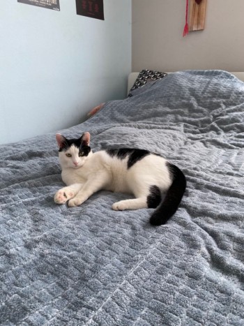 biało-czarny, zielone oczy, trochę zwisający brzuch