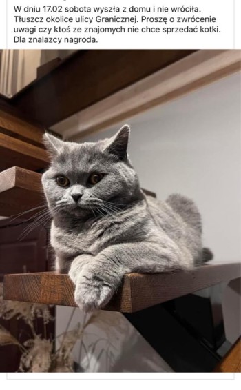 Data zaginięcia: 17/02/2024 Miejscowość: Tłuszcz Telefon: +48503055766 Numer mikroczipa: 616099120050509 Nr ID szczepienia: Płeć: Samica Gatunek: Kot Rasa: Kot brytyjski